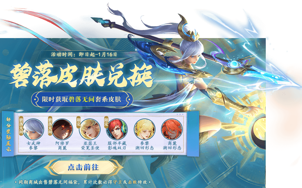 碧落皮肤兑换开启,女武神-参黎、阿修罗-商麓、亚瑟王-荣冕圣使、泰坦巨人-举重冠军、商麓溯回形态、参黎溯回形态等你来拿!