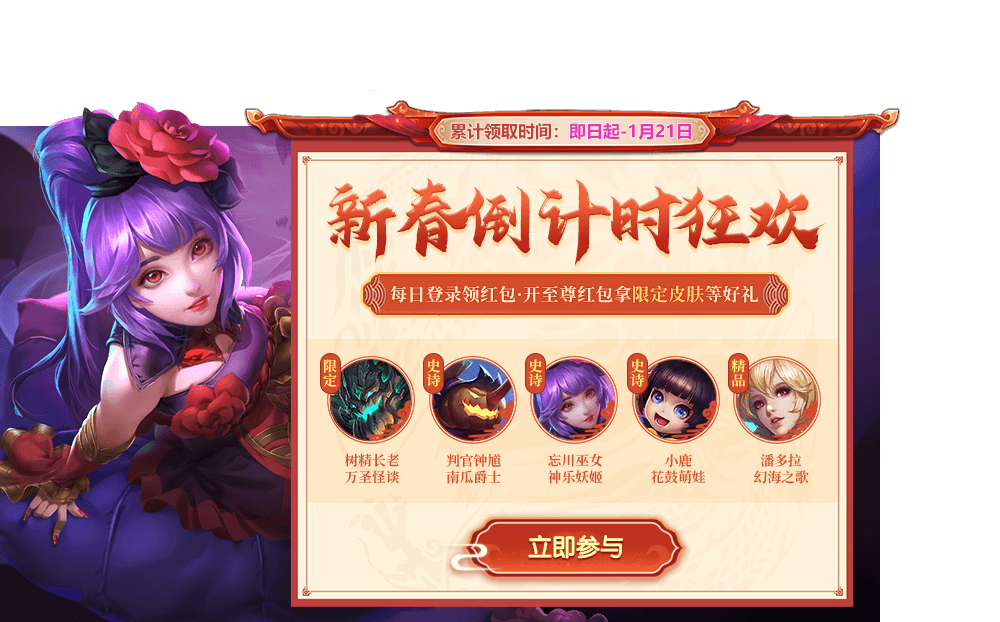 活动期间,每日登录领取普通红包,领取所有普通红包还可额外获得至尊红包,开至尊红包必得树精长老-万圣怪谈 、判官钟馗-南瓜爵士、忘川巫女-神乐妖姬、罪业狂屠-朋克狂屠等永久皮肤奖励。