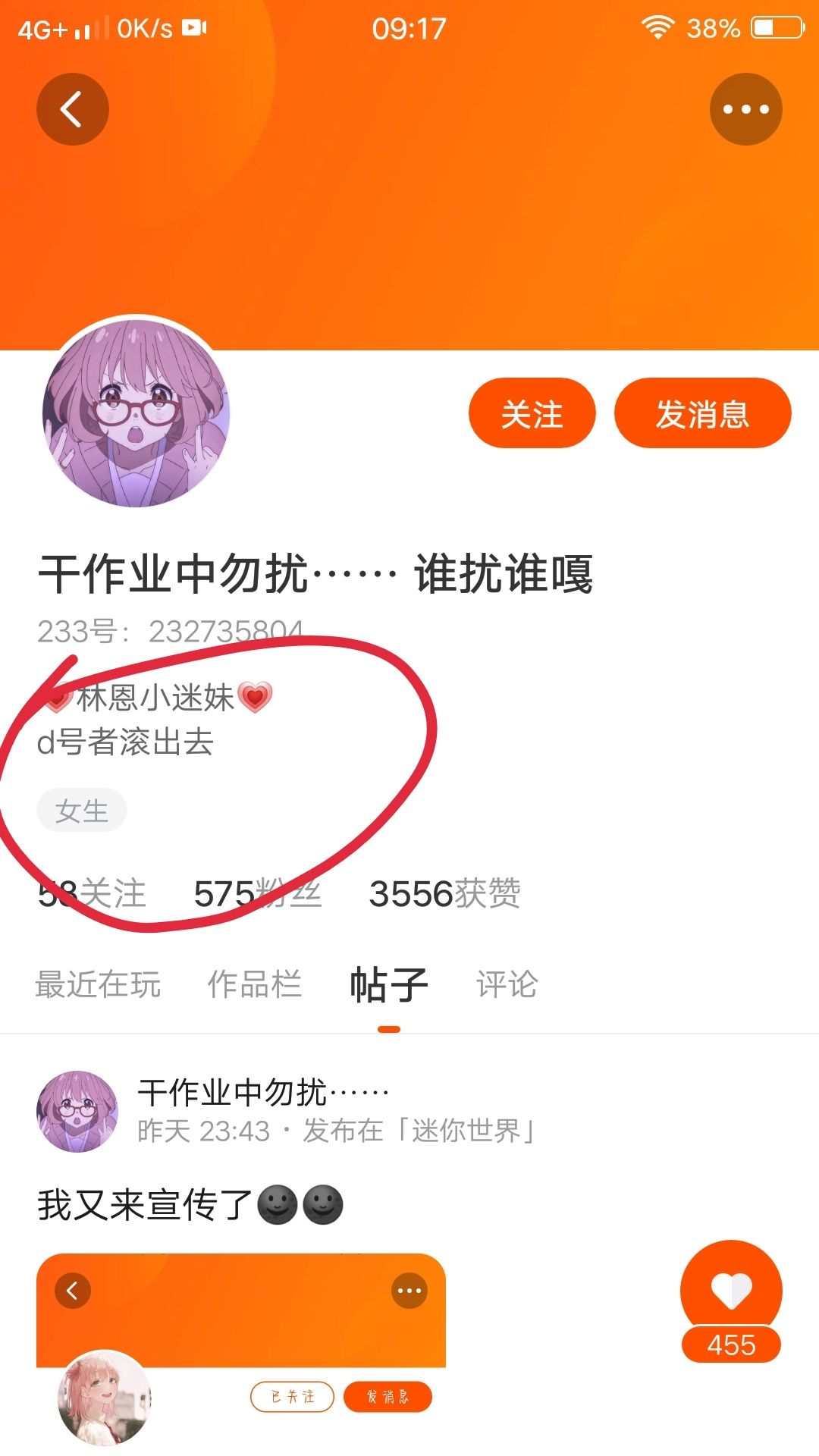你看我标的圆圈,我根本不认识他,他说我是一只小狗希望大家可以举报一下她,谢谢