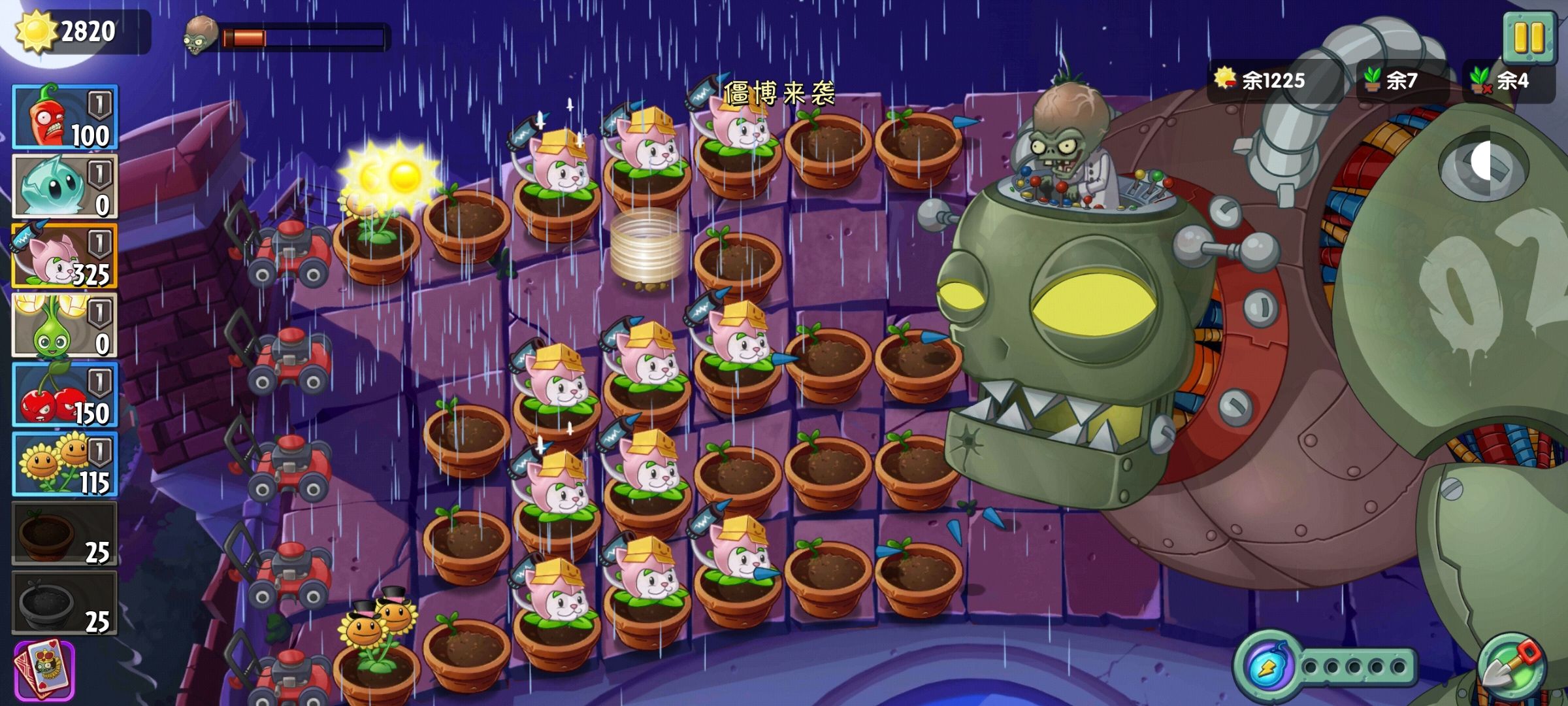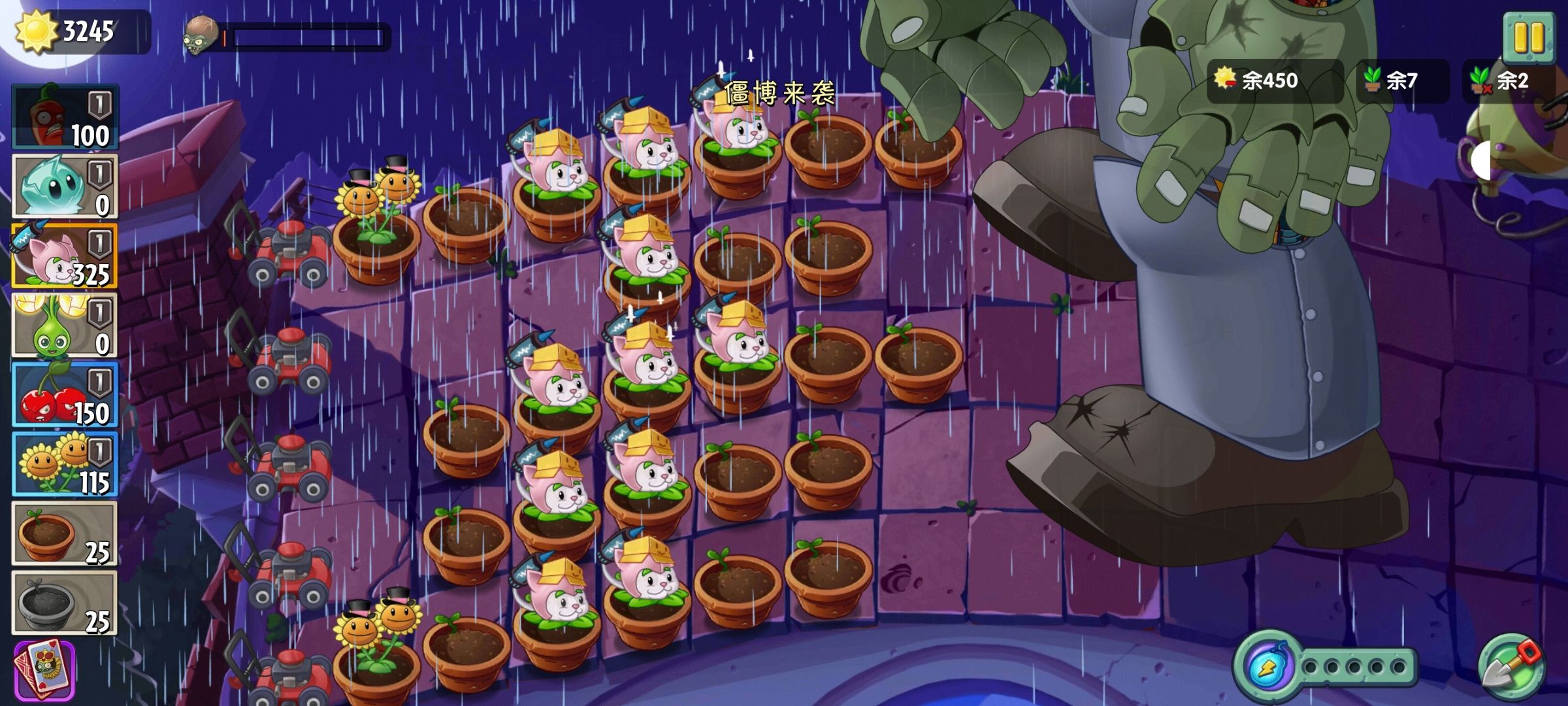 损失八颗植物耗掉僵王第二管血 这时就不用补向日葵了 因为有阳光限制产完阳光也用不了 只需要多种猫尾草 僵王会放大量巨人 只需要补花盆拖住即可(前期攒的能量豆可以用一下)