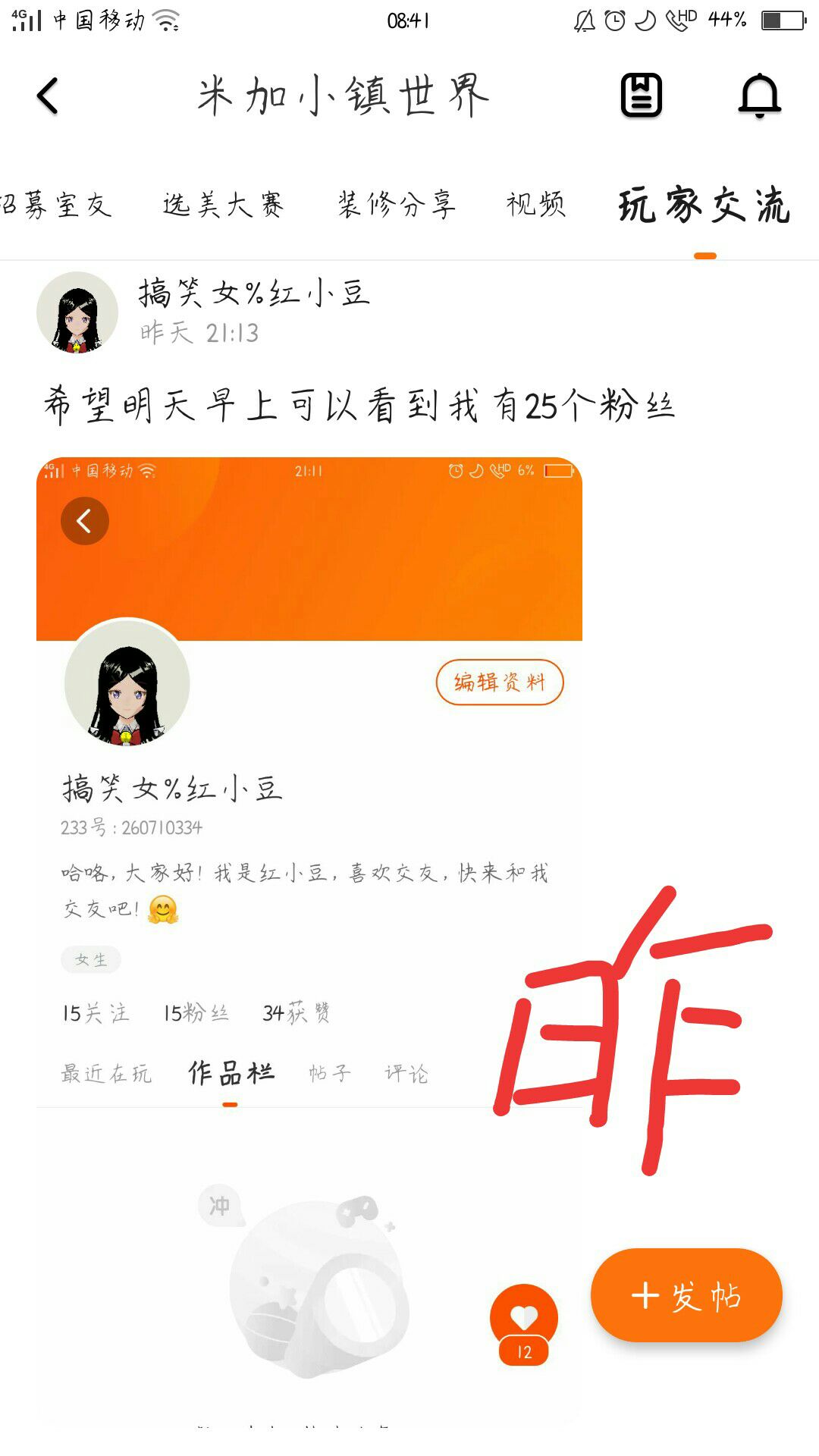 你们太给力了,昨天是15个粉丝,今天是29个,太感谢你们了!贴贴☺(字写得不太好哈)