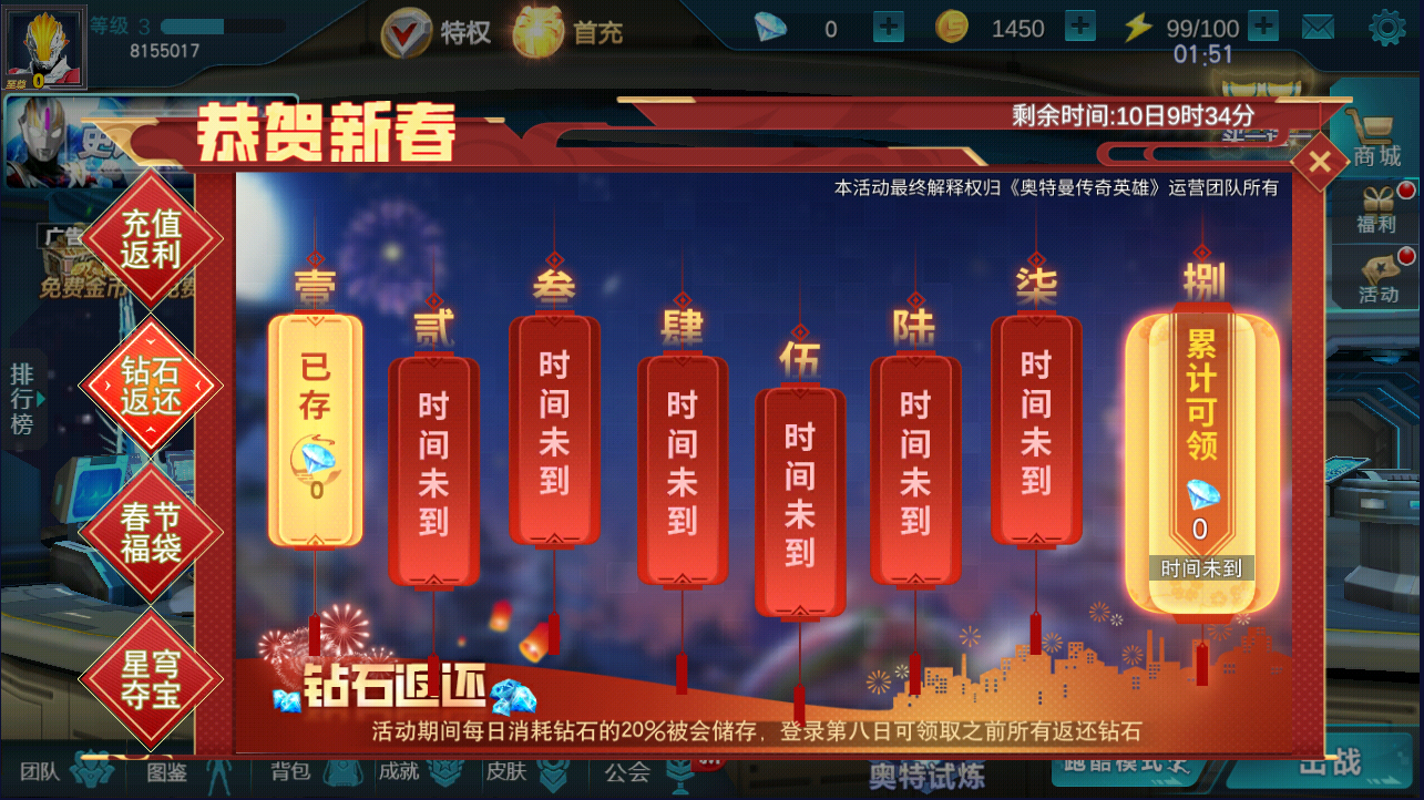 年年有余,消费返利。活动时间内每日消耗的钻石的20%会被储存在红包内,登录第八日即可领取七日内累计返还的所有钻石~