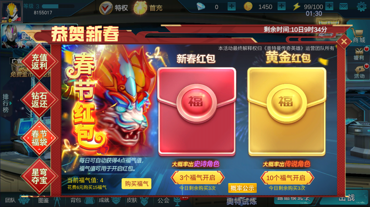 五福临门 红包惊喜。活动时间内玩家使用福气可开启新春红包和黄金红包,每日登录游戏可自动获得福气值,积攒福气值开启新春红包,黄金红包有大概率开出传说级角色。新春红包,传说献礼~