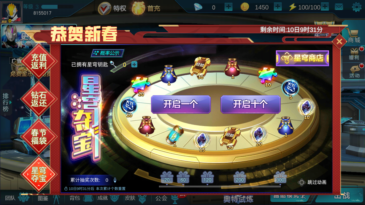 吉星高照 星穹献礼。活动时间内使用星穹钥匙即可抽奖,十连抽享专属折扣,夺宝有机会获得万能碎片、传说英雄选择器和等离子精魄等稀缺道具,更有赛迦奥特曼、泰迦奥特曼煜坤形态等你拿,新角色泽塔德尔塔天爪加入奖池,夺宝限时开启,快来抽取吧!