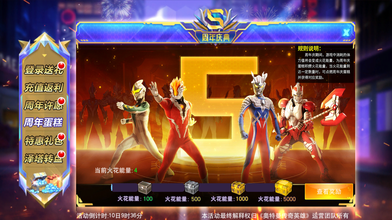 收集火花 召唤祝福。周年庆期间,游戏中消耗的体力值将会变成火花能量,为周年庆蛋糕积赞火花能量,当火花能量到达一定数量时即可兑换周年庆蛋糕并获得对应奖励,奖励内容包括超级奥特核心、等离子精魄、六星直升券和传说英雄选择器。