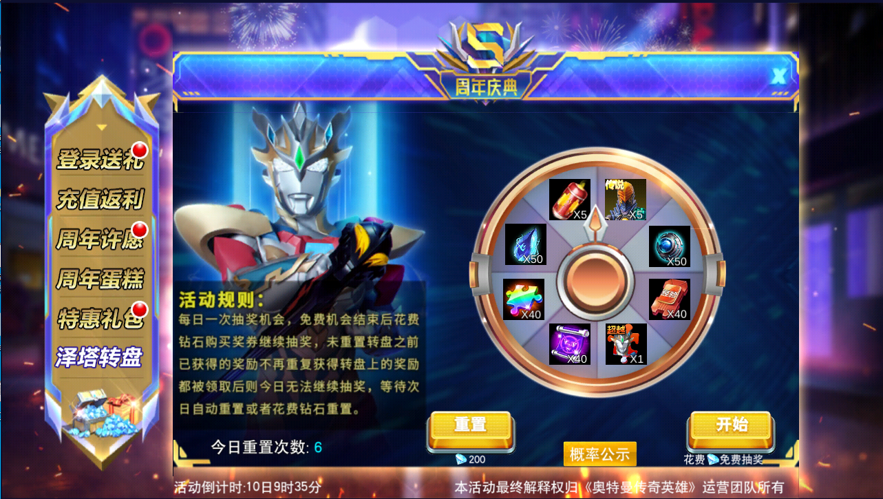 第四重:五周年限定转盘来袭,登录即送抽奖机会,泰迦奥王免费获取