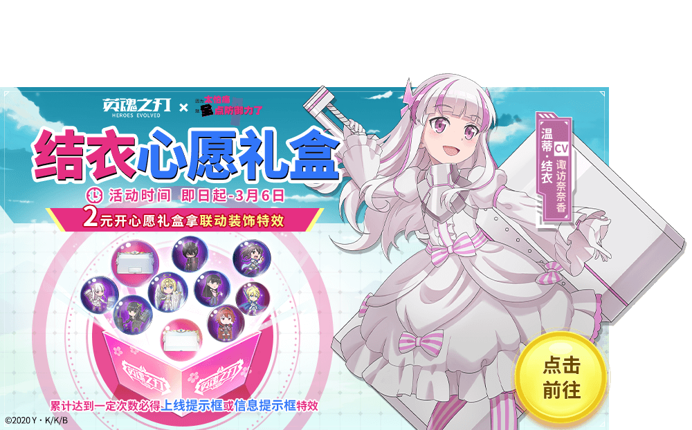 花费20点券可购买结衣心愿礼盒,打开必得茶杯投影1天体验卡,并有机会获得大天使信息提示框、大天使上线提示框、联动表情等装饰道具。