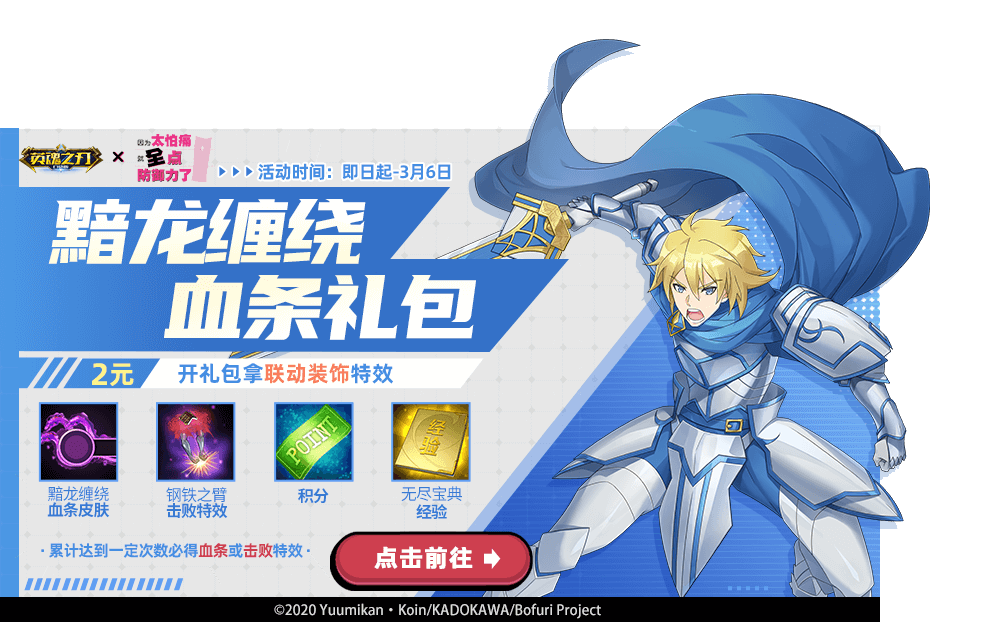 花费20点券可购买黯龙缠绕血条礼包,打开必得茶杯投影1天体验卡,并有机会获得黯龙缠绕血条皮肤、钢铁之臂击败特效、积分、无尽宝典经验等道具。礼包累计开启135次,必得联动血条击败自选包,打开自选以下奖励之一:黯龙缠绕血条皮肤、钢铁之臂击败特效。
