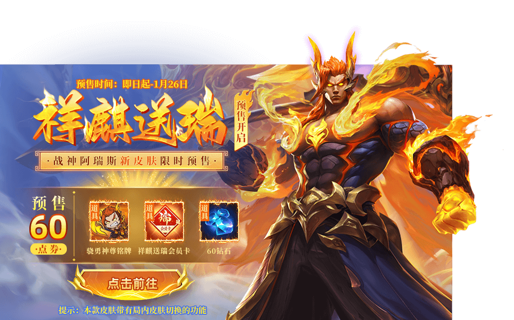 花费60点券即可获得骁勇神尊铭牌铭牌、祥麒送瑞会员卡以及60钻石;拥有祥麒送瑞会员卡的玩家,在购买祥麒送瑞系列皮肤时,可享受专属会员价。