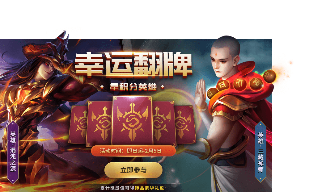 幸运翻牌活动开启!参与就有机会获得全新积分英雄混沌之源、三藏禅师等奖励。