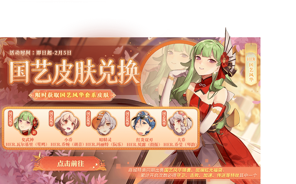 国艺皮肤兑换奖池更新!限时获取全新国艺风华套系皮肤女武神-HER.瓦尔基里(笙鸣)\红炎双刃-HER.贝露(鼓振)、暗精灵-HER.玛丽特(阮乐)、大乔-HER.乔莹(琴韵)、圣女贞德-秋墨花灵等好礼!