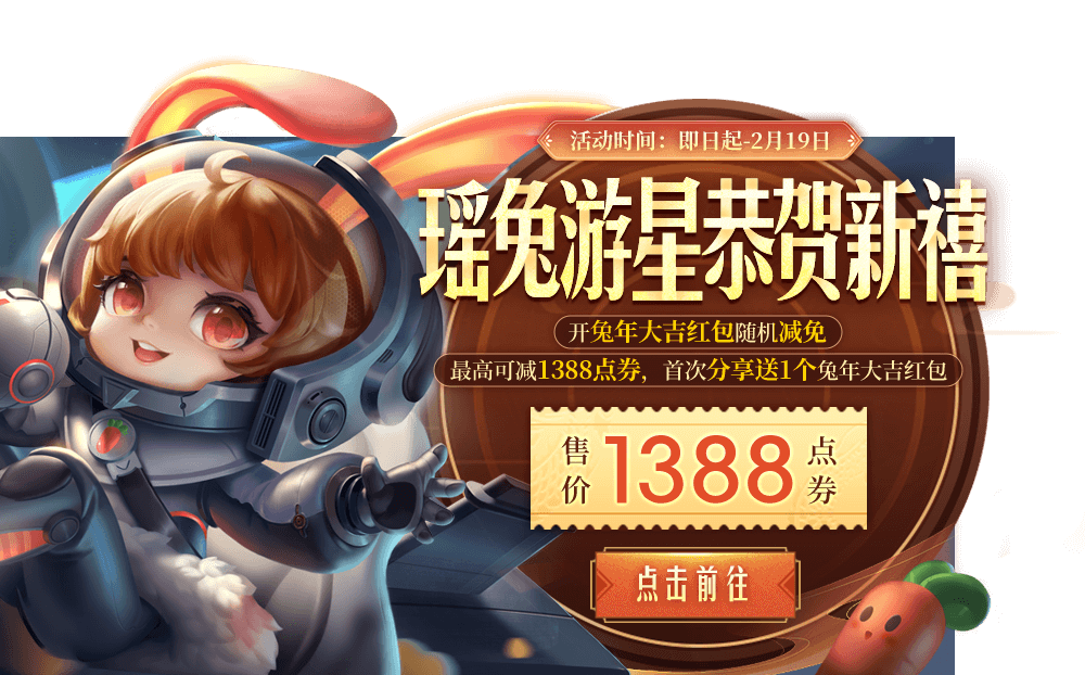 活动期间,可通过开红包方式,减免皮肤价格,每打开1个兔年大吉红包都可减免不同额度点券,累计最高可减1388点券!