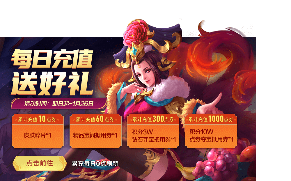 活动期间,每日充值指定额度即可获得点券夺宝券、积分等精彩奖励,好礼不容错过!