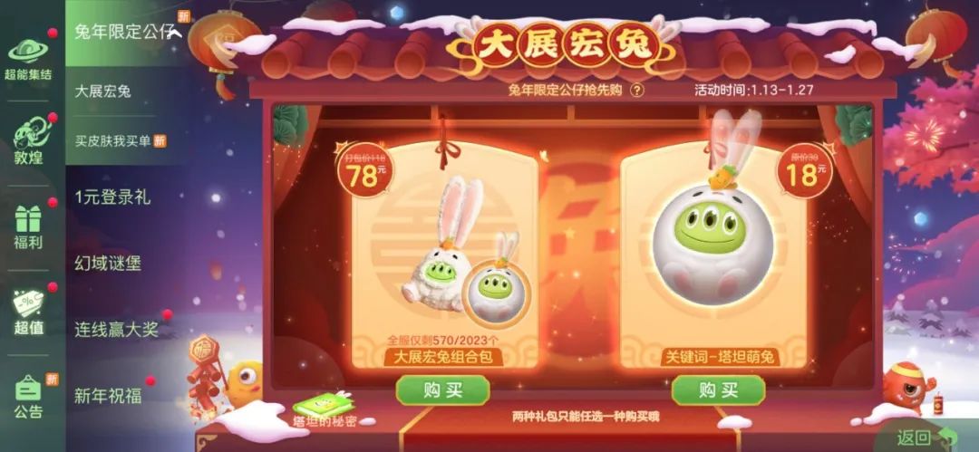 超越妹妹同款兔年限定公仔-塔坦萌兔游戏内火热售卖中,购买大展宏兔组合包即可获得兔年限定公仔-塔坦萌兔*1和兔年限定关键词-塔坦萌兔*1。