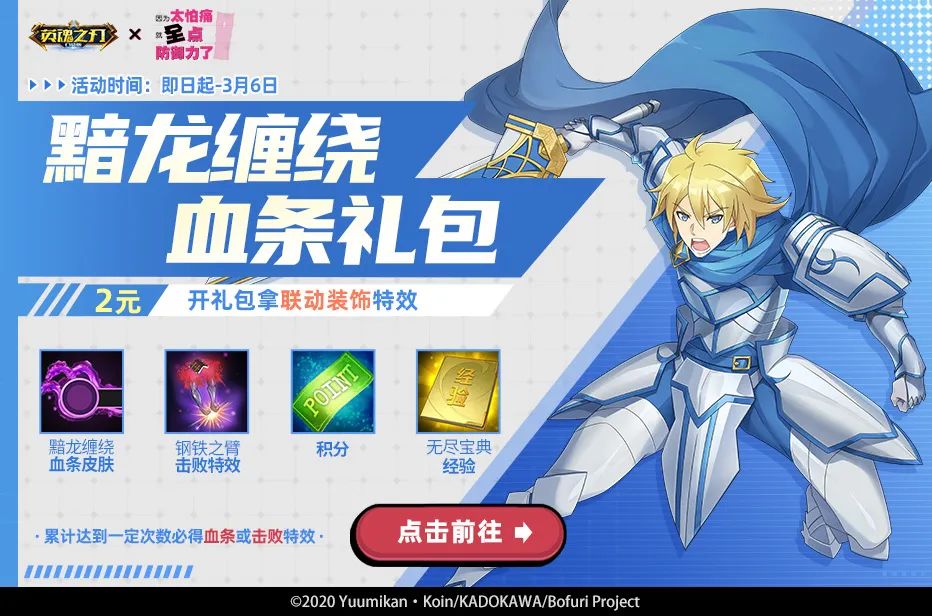 1月20日-3月6日,活动期间商城上架黯龙缠绕血条礼包,花费20点券可购买,打开必得茶杯投影1天体验卡,并有机会获得黯龙缠绕血条皮肤、钢铁之臂击败特效、积分、无尽宝典经验等道具。
