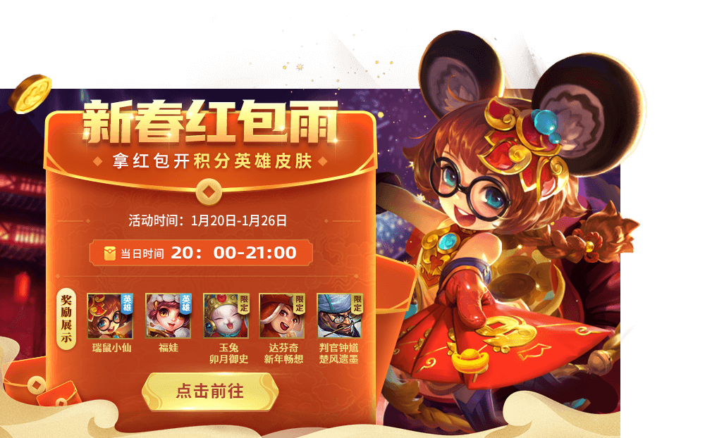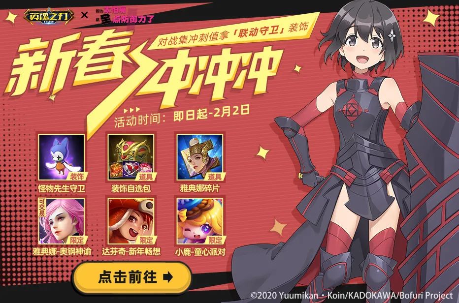 1月20日-2月2日,开启新春冲冲冲活动,通过参与对战累计个人及全服冲刺值,累计冲刺值到一定数量可以解锁相应奖励,最高有机会获得雅典娜-奥钢神谕、泰坦巨人-举重冠军、小鹿-童心派对、孙尚香-舞动无双、全新怪物先生守卫等奖励!