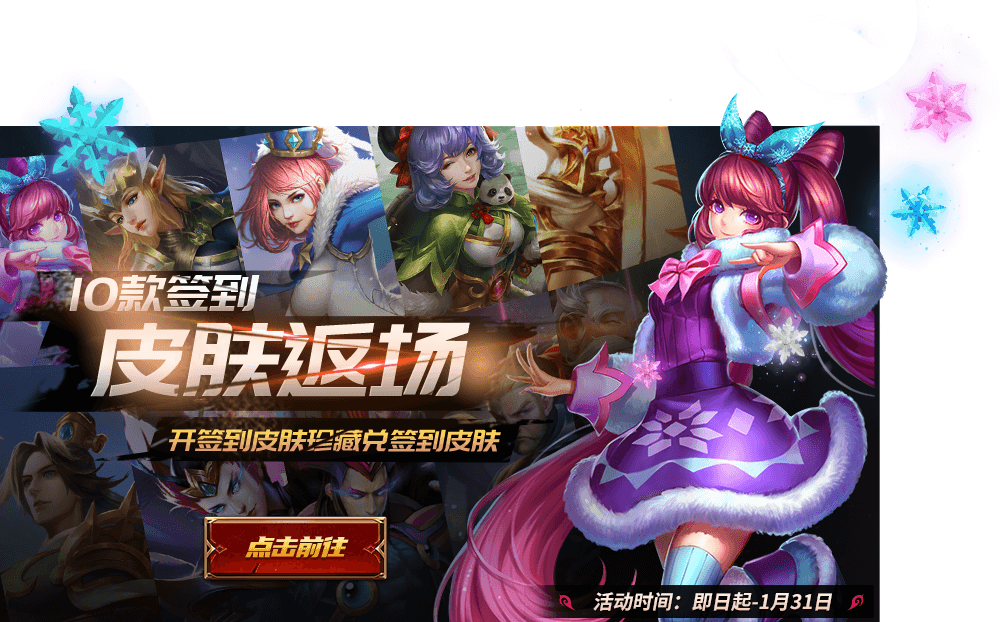 1月22日-1月31日,商城上架“签到皮肤珍藏”,打开可获得3-99个签到皮肤碎片,通过签到皮肤碎片可兑换以下十款签到皮肤: