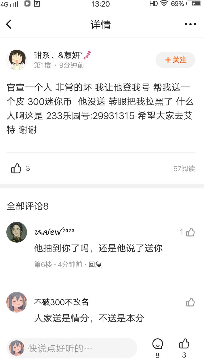 这个人首先是说他找人要皮肤给了密码别人没送把他拉黑了,然后就要艾特她,说她坏,然后我就说人家送你是情分不送你是本分,他只回个哦,然后那个不送她的人来了,她解释她的钱不是大风刮来的,她也只回个哦,还在那里发哭脸表情包,感觉有点像装可怜(是不是装可怜你们来说,我不确认),他什么意思啊,人家不送是本分,为什么非要让她送,这不是明摆着SSD吗,她也没说是不是抽到她了,或者是她说要送给她,就真的有点不太明白😓