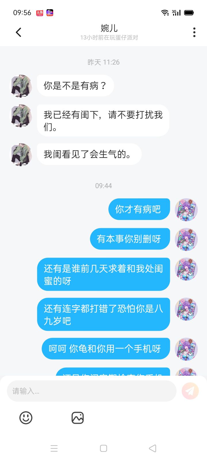 事情是这样的 ,有一天他加我好友 一上来就问我处闺蜜吗 因为我已经有闺蜜 所以我不处 有一天他就把我删除了 ,然后我又加他 ,同意他又说了几句话 然后又把我删了 ,我就说是一个公主病 ,然后他就说我有病 ,然后说我已经有闺蜜了 请不要再打扰我们 ,给大家发个图片不相信的话 大家可以看一下