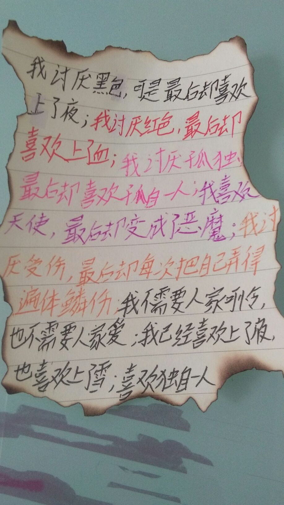 我讨厌黑色,最后却喜欢上了夜,我讨厌红色,最后却喜欢上了血,我讨厌孤独,最后却喜欢孤自一人,我喜欢天