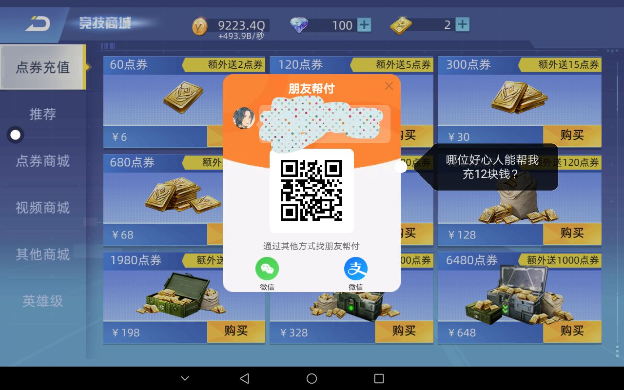 哪位好心人能帮我充12块钱?