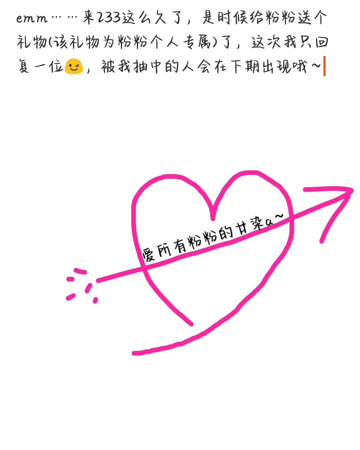 emm……来233这么久了,是时候给粉粉送个礼物(该礼物为粉粉个人专属)了,这次我只回复一位😉,被我抽中的人会在下期出现哦~