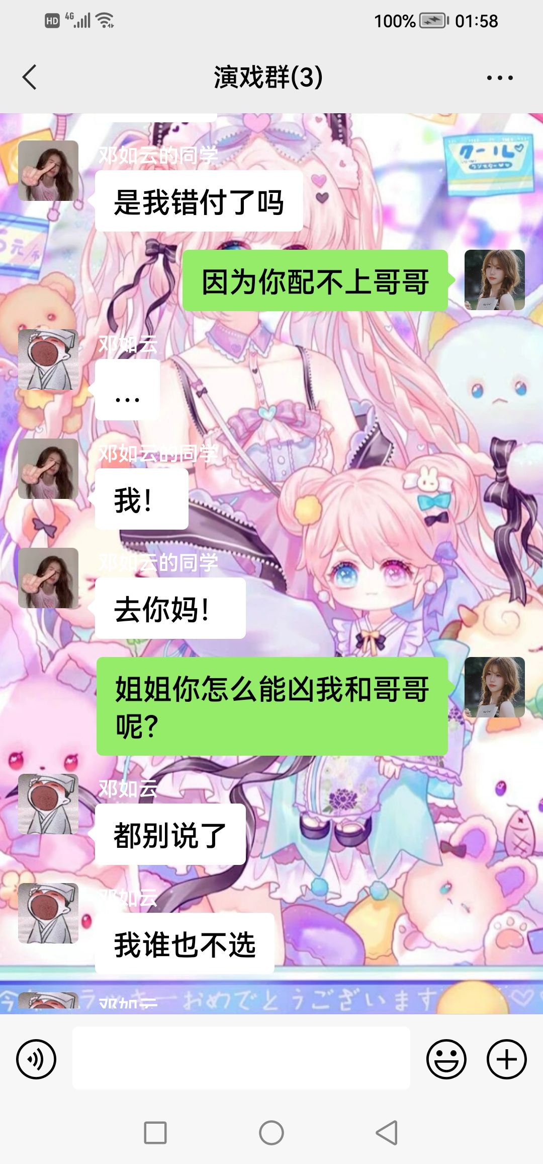 那个叫邓茹芸的,我是他姑姑他创了一个群,结果呢,演戏我是茶茶,你们谁能体谅一下我呀