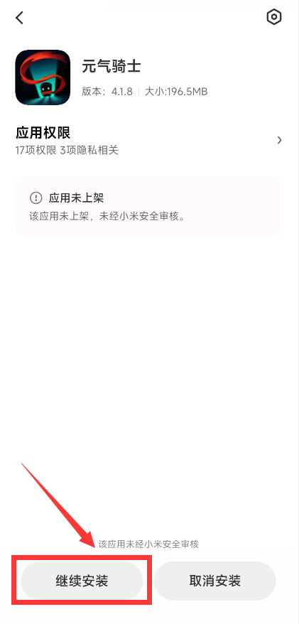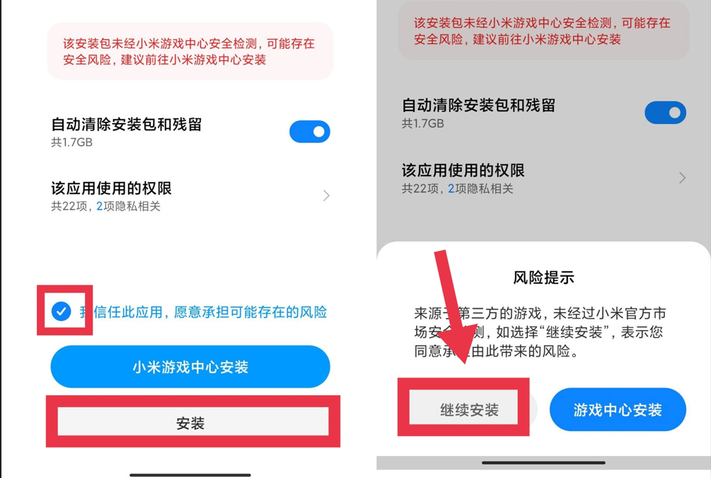 小米新版系统玩家:点击【继续安装】——点击【安装】即可完成游戏安装。