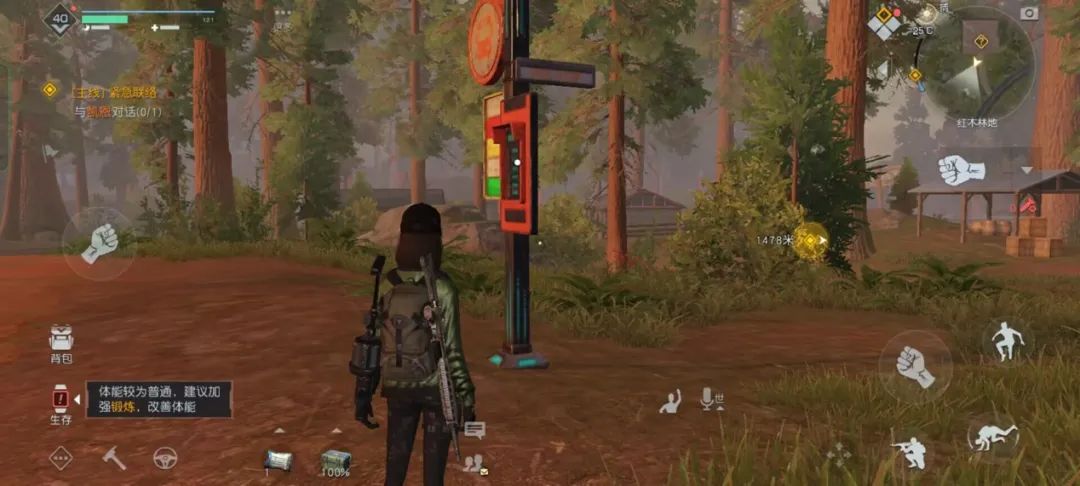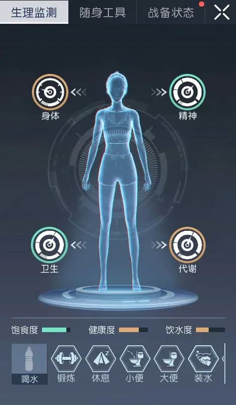 经历完战斗,一定不要忘了打开生存仪检查自己的健康状态以及卫生状态,一旦发现黄色提示便需要进行对应的生存活动来恢复状态,同时也要记得给自己的水壶装满水呦~