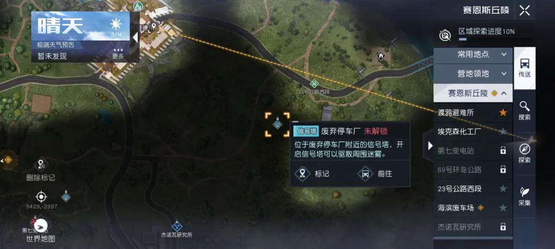 除了上述路牌外,打开地图,地图上会出现很多蓝色的小图标,这些位置是信号塔,激活信号塔后,可以驱散周边的迷雾,使地图上这块区域显得更清晰,这对于接下来的探索就更加有把握了。