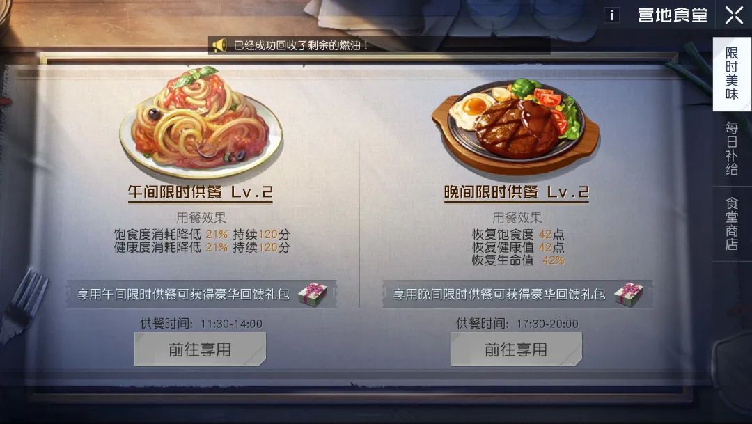 加入营地后,记得前往营地食堂吃营地供餐哦~温馨提示:各位幸存者千万别错过饭点了,不仅能恢复身体各项属性,还会提供生存buff。