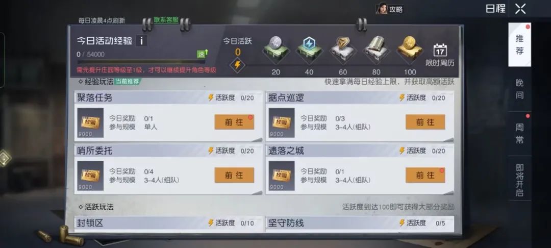 吃饱喝足,元气满满,让我们来看看大世界有什么精彩的日常活动呢?啊~原来有这些,先来一场紧张刺激的航天基地作战,锻炼我们的战斗技巧,努力成为更强大的幸存者吧!