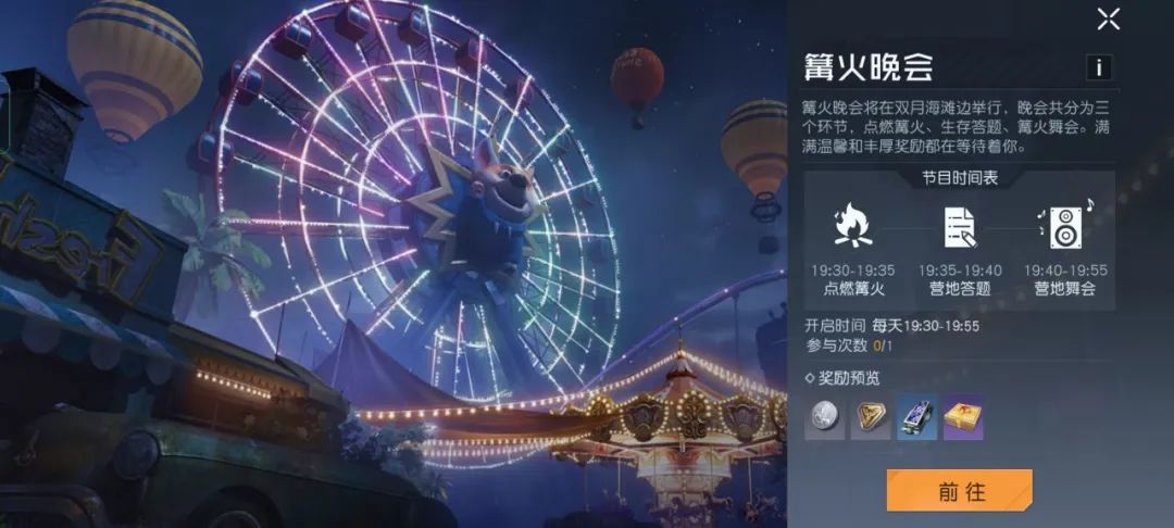 到了晚上,营地将举办篝火晚会,不仅有烤火,答题活动,还有食品补给,这可是一个放松自己,结交好友的好机会,记得来参加哦。