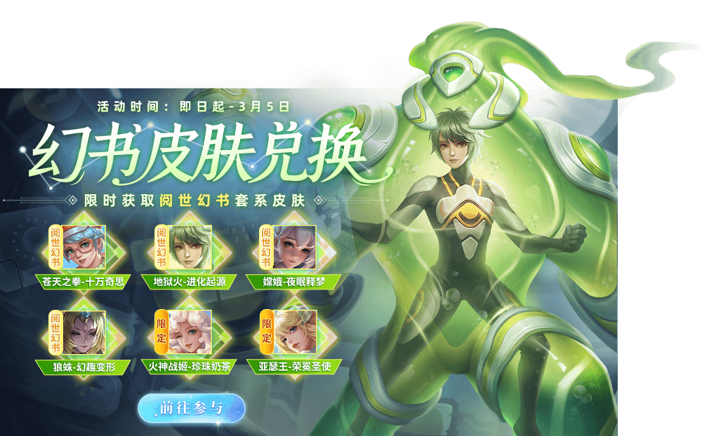 2月26日-3月5日,幻书皮肤兑换开启!通过每日登录获得每日登录礼包,累计兑换币可兑换到苍天之拳-十万奇思、地狱火-进化起源、嫦娥-夜眠释梦、狼蛛-幻趣变形、火神战姬-珍珠奶茶、亚瑟王-荣冕圣使、判官钟馗-楚风遗墨、树精长老-万圣怪谈等好礼!