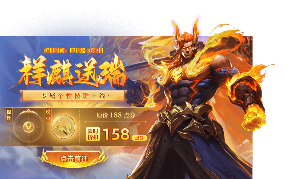 2月24日起商城上架“战神阿瑞斯-祥麒送瑞”皮肤专属个性按键,首周折扣仅需158点券!