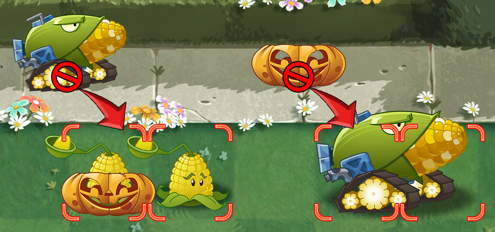●藤蔓植物无法种植在占地超过一格的植物上(如玉米加农炮),同理,如果当前格子内已经存在藤蔓植物,占地超过一格的植物也无法被放置种植);