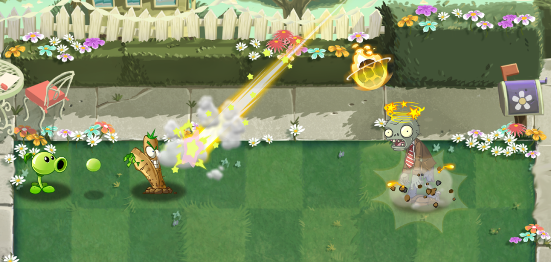 本垒打将把被击中的豌豆类子弹击出场外。片刻后,豌豆变成燃烧着熊熊火焰的陨石重返草坪,砸向场上最靠近底线的僵尸,造成1格范围的高额伤害并造成眩晕效果。