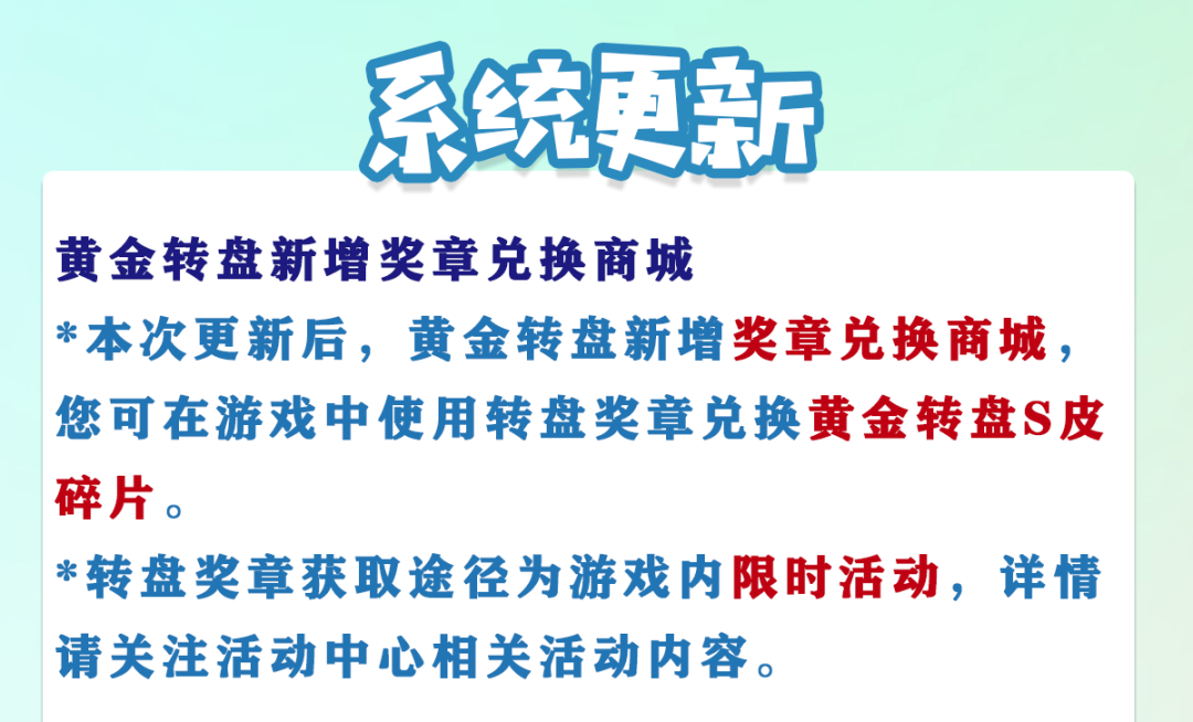 *本次更新后,黄金转盘新增奖章兑换商城,您可在游戏中使用转盘奖章兑换黄金转盘S皮碎片。