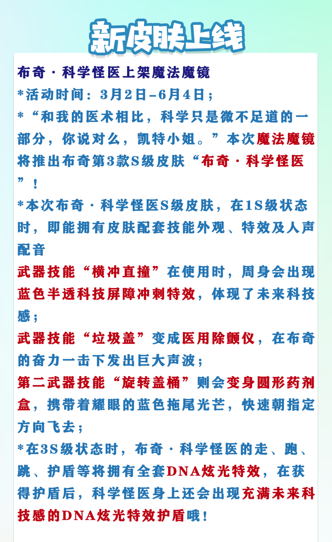 1.全新S级皮肤布奇·科学怪医上线