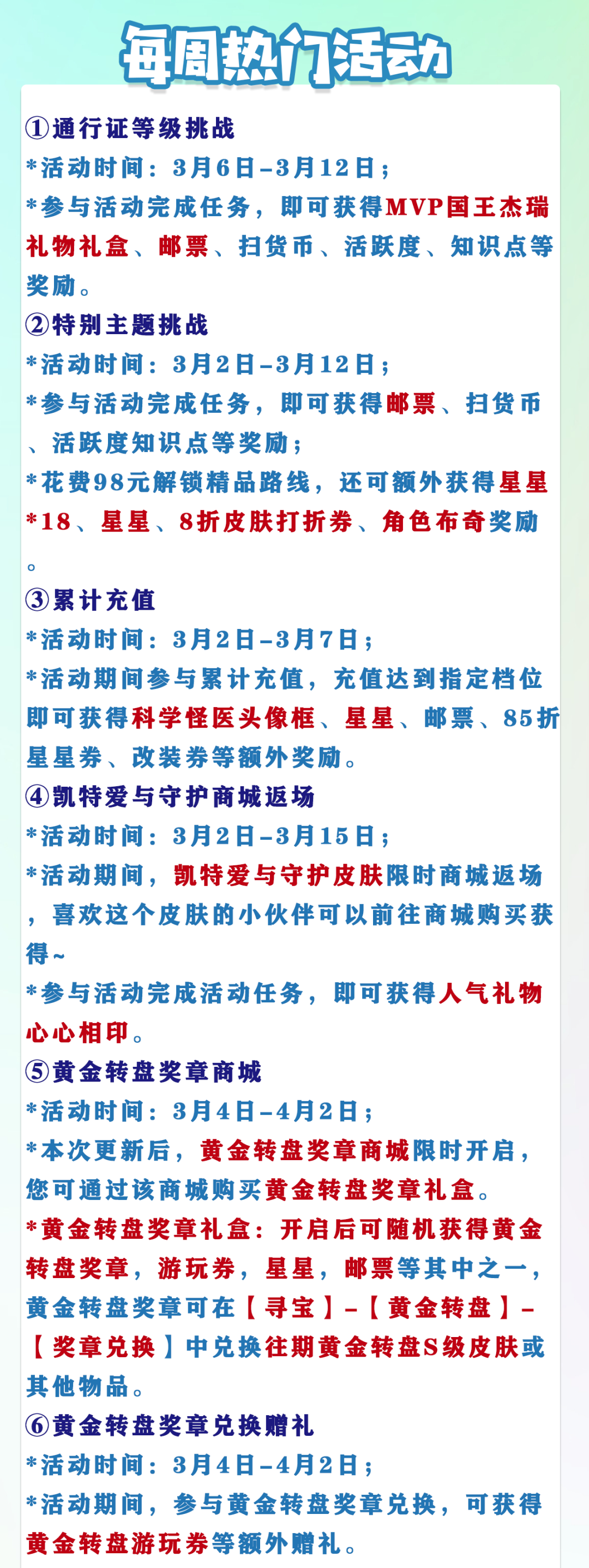 *黄金转盘奖章礼盒:开启后可随机获得黄金转盘奖章,游玩券,星星,邮票等其中之一,黄金转盘奖章可在【寻宝】-【黄金转盘】-【奖章兑换】中兑换往期黄金转盘S级皮肤或其他物品。