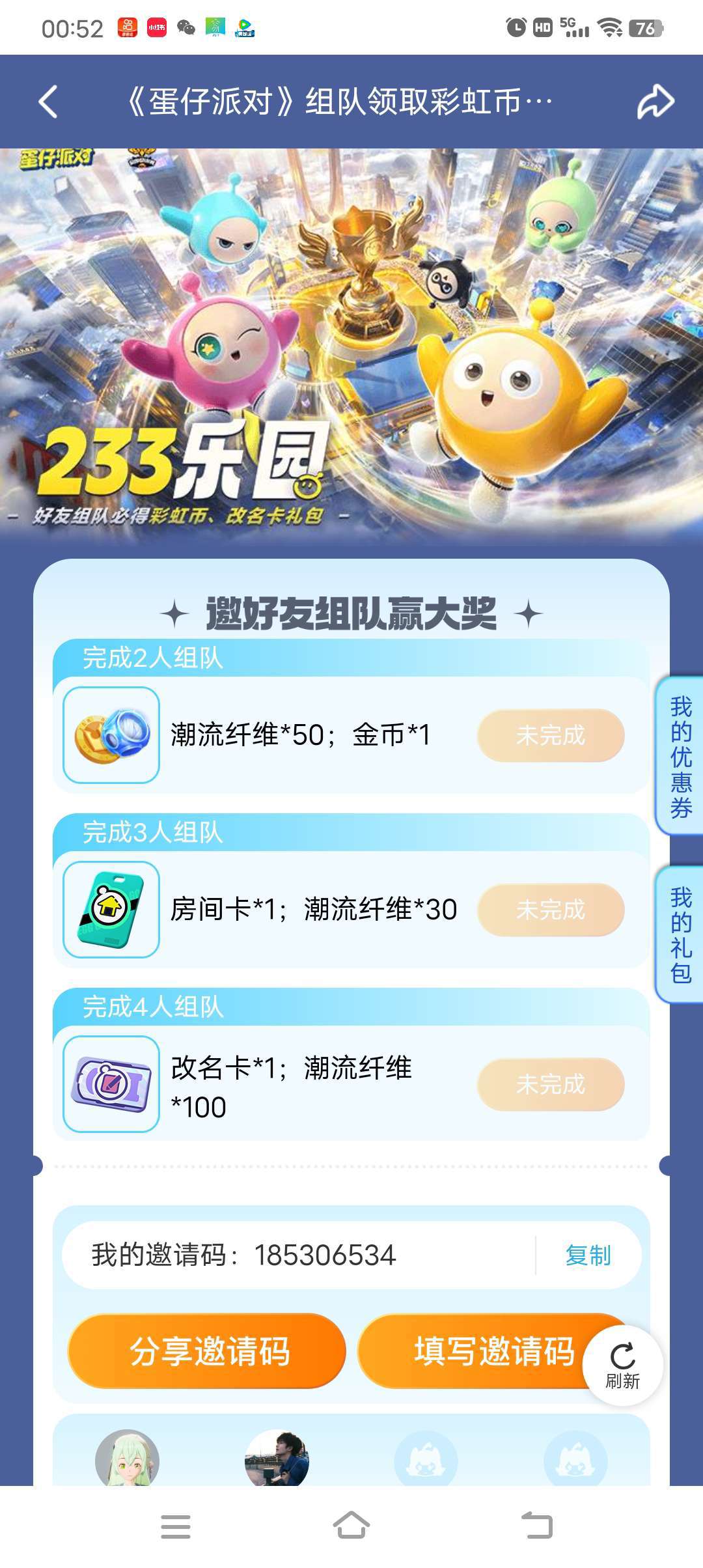 蛋仔组队活动,快点跟我组队,一人送一个许愿币(真的😊)邀请码:185306534