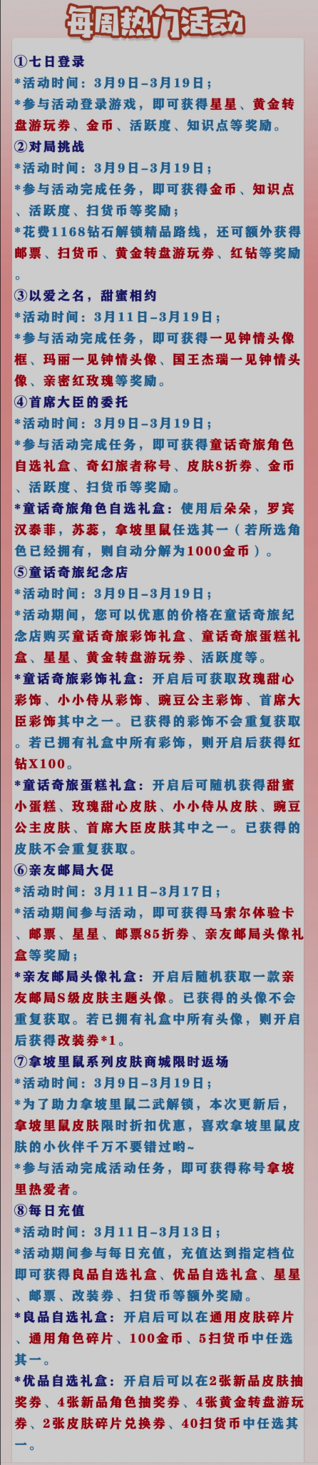 *参与活动完成任务,即可获得童话奇旅角色自选礼盒、奇幻旅者称号、皮肤8折券、金币、活跃度、扫货币等奖励。