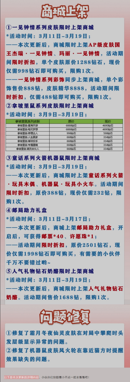 ——本次更新后,商城限时上架AP级皮肤国王杰瑞·一见钟情、玛丽·一见钟情,活动期间限时折扣,单个皮肤原价1288钻石,现价仅需998钻石即可购买,,限购1次。