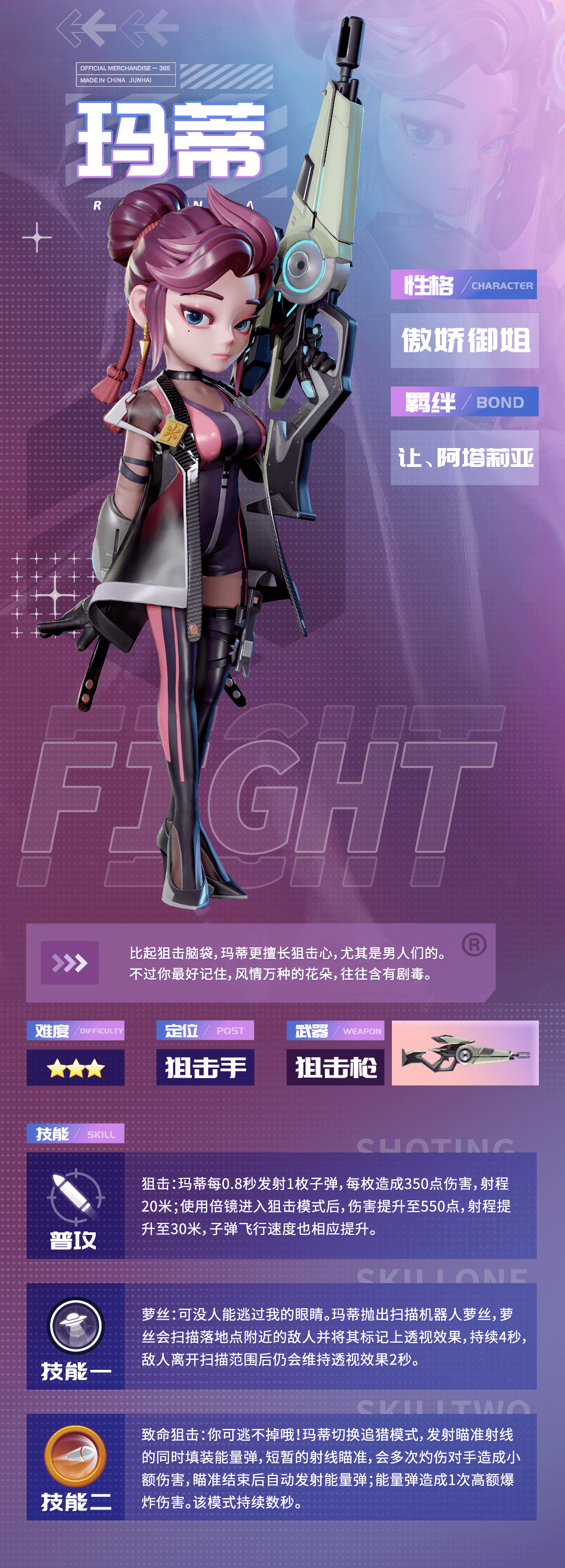 【普攻】狙击:玛蒂每0.8秒发射1枚子弹,每枚造成350点伤害,射程20米;使用倍镜进入狙击模式后,伤害提升至550点,射程提升至30米,子弹飞行速度也相应提升。