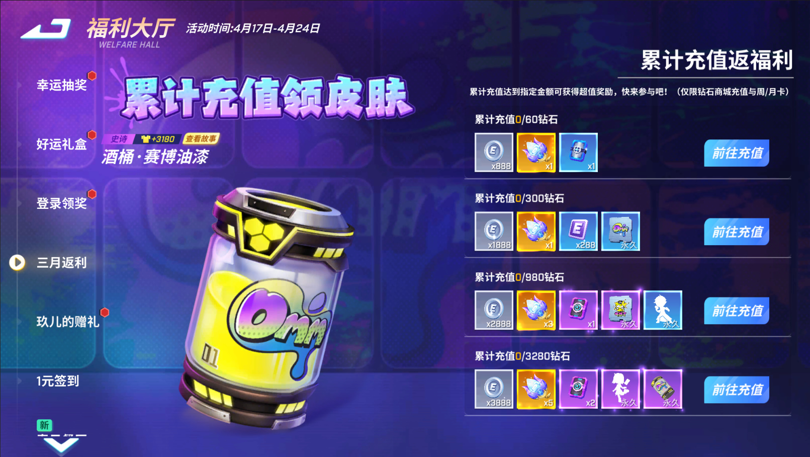 活动期间,累计充值达一定额度可获得永久道具卡皮肤【酒桶·赛博油漆】以及限定涂鸦、微光之种等丰富奖励!