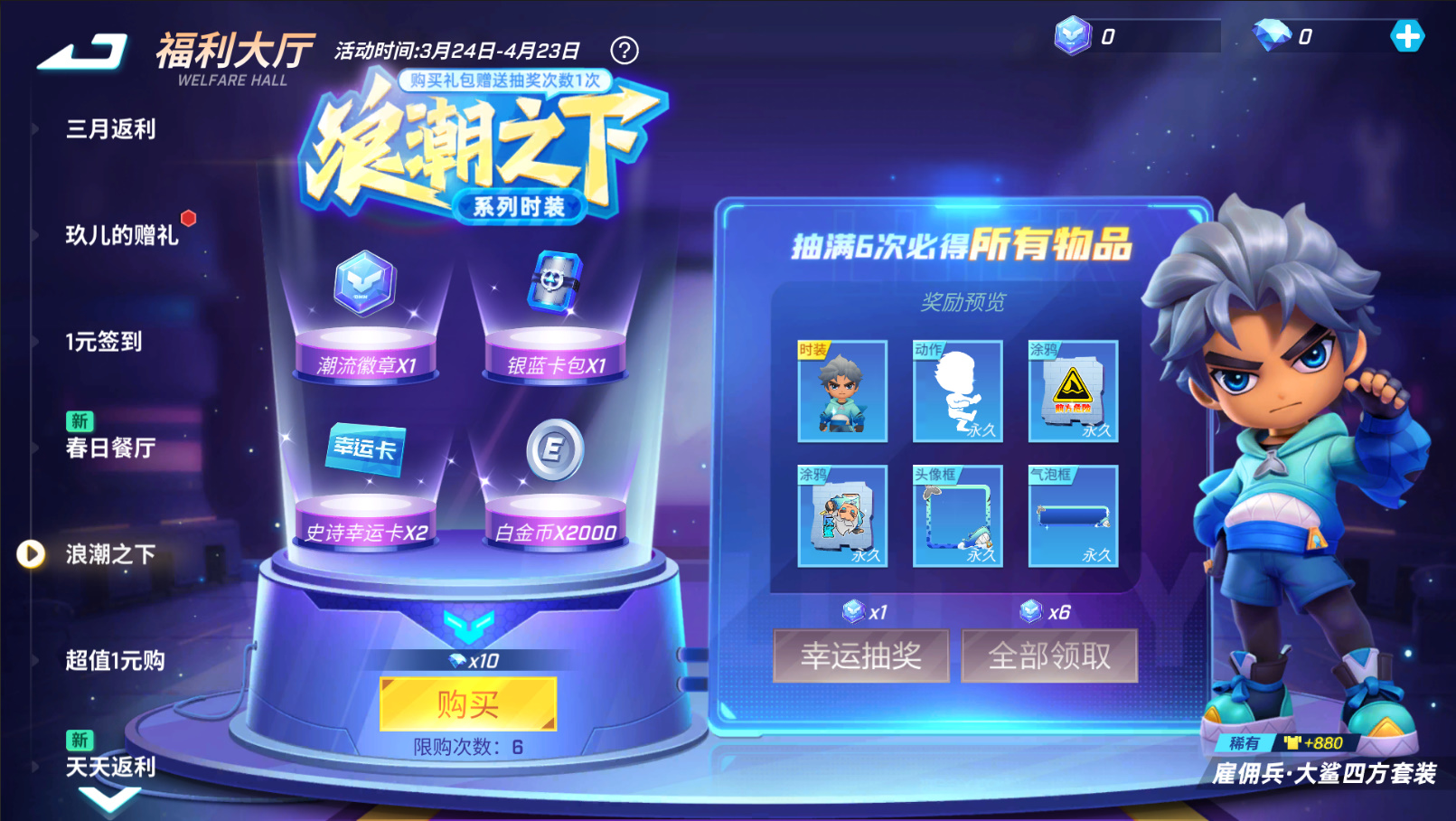 购买潮流徽章即可参与幸运抽奖,至多6次即可获得全新时装【雇佣兵·大鲨四方套装】!