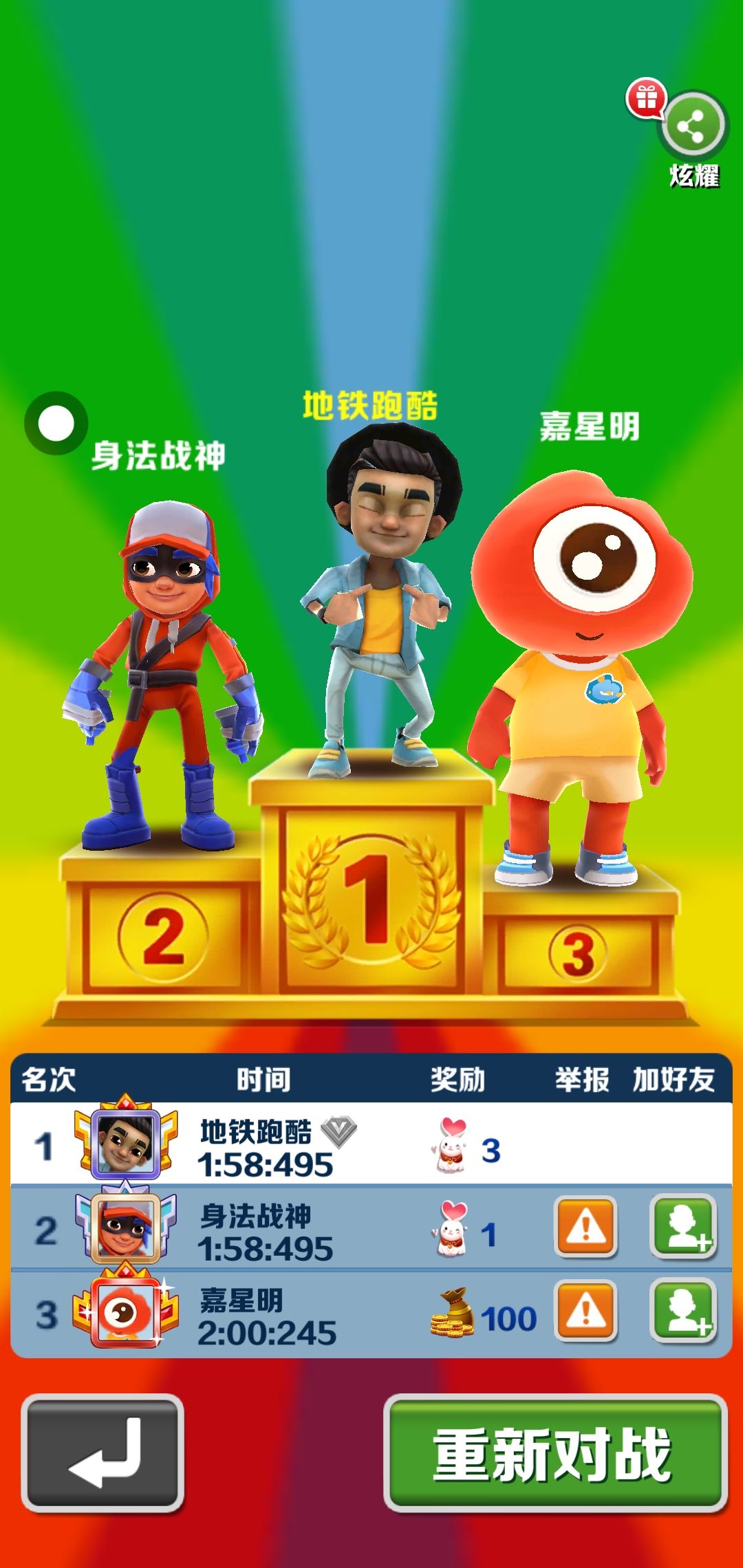 运气真好😃,同时到达终点,我却是第一