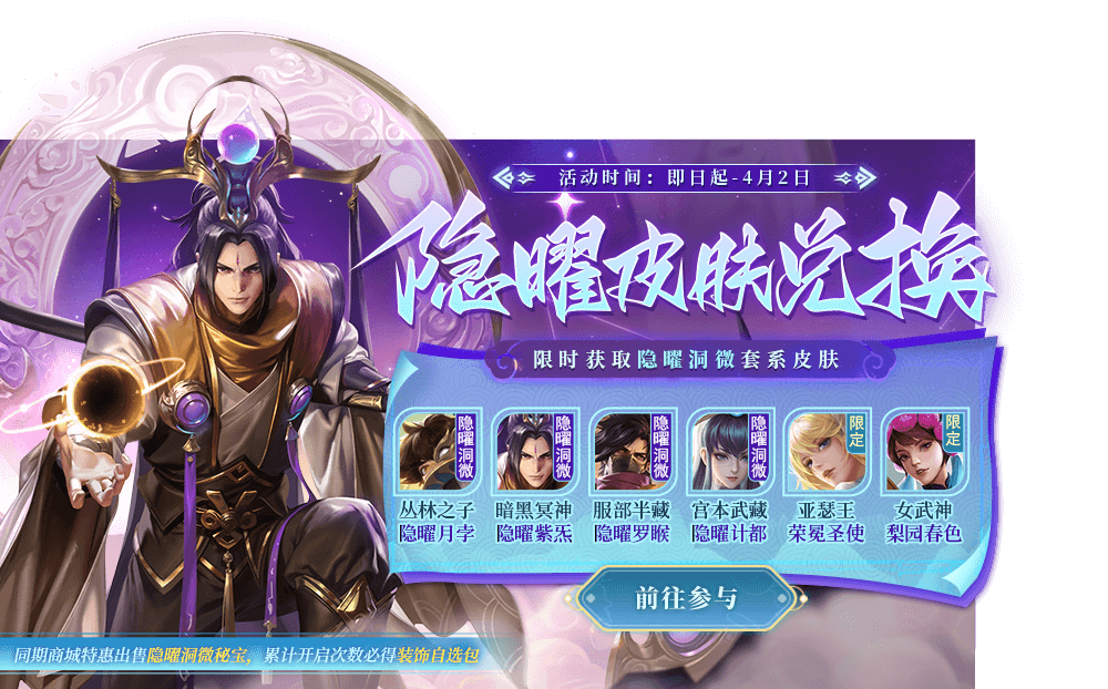 3月25日-4月2日,隐曜皮肤兑换开启!活动首次抽取仅需5点券,每日首次抽取仅需10点券!限时获取宫本武藏-隐曜计都、服部半藏-隐曜罗睺、暗黑冥神-隐曜紫炁、 丛林之子-隐曜月孛、亚瑟王-荣冕圣使、女武神-梨园春色等奖励~