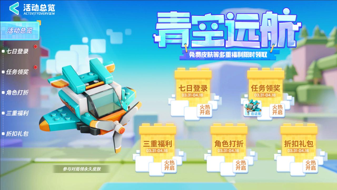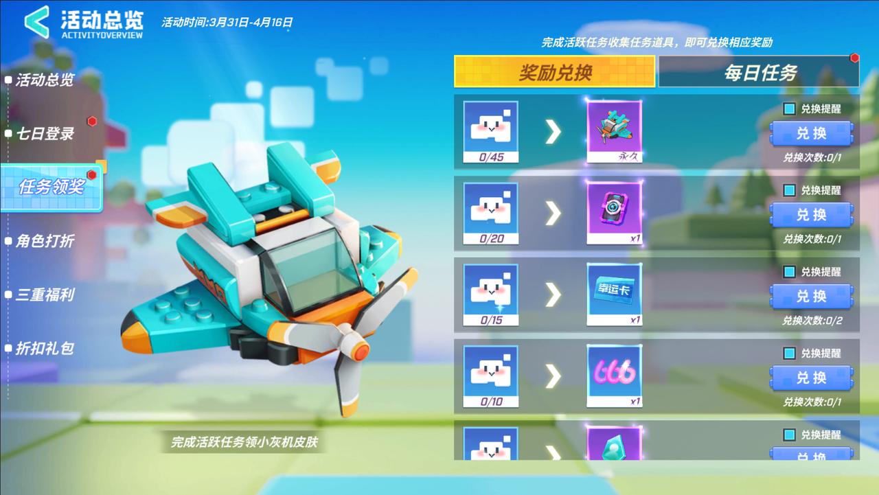 积累一定数量的【像素云朵】可以兑换丰富奖励哟~完成活跃任务就有全新皮肤【小灰机·拼装领空】等你拿~
