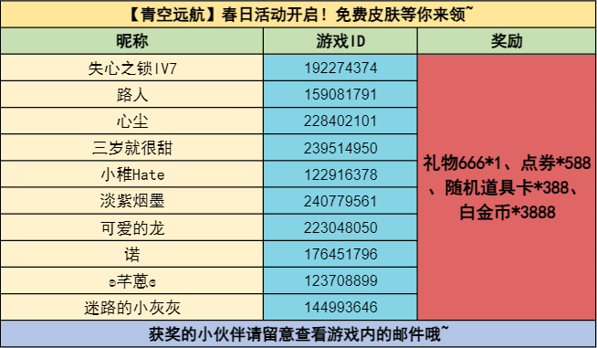春日回忆录(10名):礼物666*1、点券*588、随机道具卡*388、白金币*3888